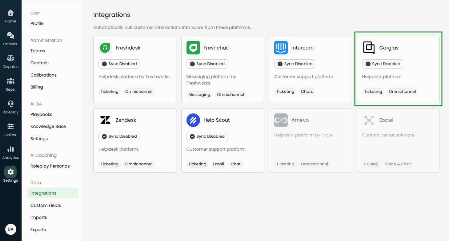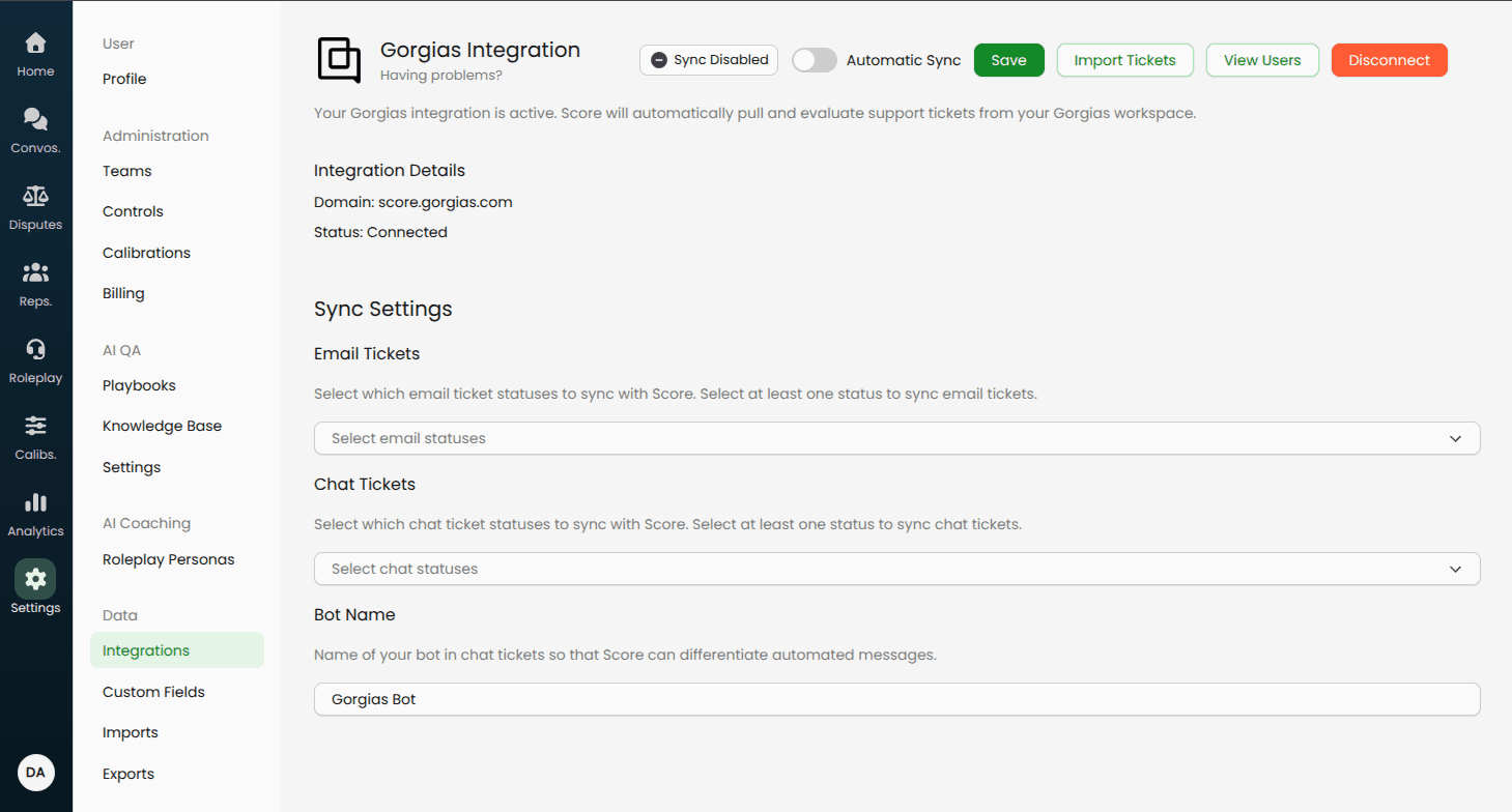 After authorization, you’ll return to the Gorgias settings page in Score.