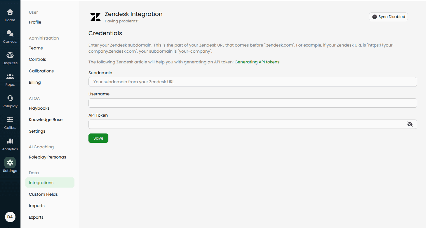 API token: Create one in Zendesk settings.